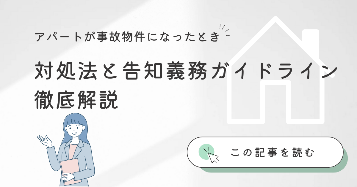 アパートで発生した死亡事故や予期せぬトラブルは、物件をいわゆる事故物件とみなす大きな要因になります。オーナーとしては、物件価値の下落や心理的瑕疵など考慮すべきポイントが多く、正しく対応しなければ後のトラブルに発展する恐れがあります。